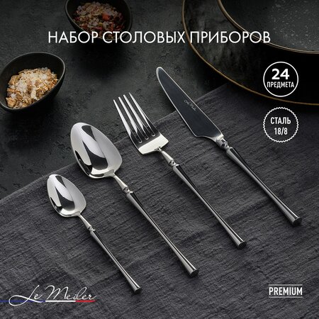 Современный и стильный набор серебристых столовых приборов из гипоаллергенной нержавеющей стали 18/8 на шесть персон (24 предмета) Le Meiler FS-280. Столовые приборы из нержавеющей стали подойдут как для личного пользования, так и в подарок на любой праздник. Дизайн приборов отлично дополнит любой кухонный интерьер и добавит эстетическое удовольствие во время приема пищи. Современный и стильный набор столовых приборов покорит Вас не только своим внешним видом, но и комфортом в использовании. Идеально подойдёт для сервировки праздничного стола и повседневного использования. Набор состоит из: вилки - 6 шт. , ножа - 6 шт. , столовой ложки - 6 шт. и чайной ложки - 6 шт. Всё упаковано в черную стильную коробку, которая отлично подойдет для подарка.