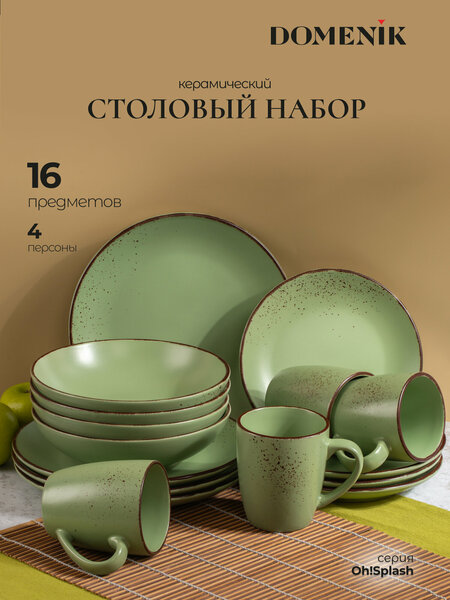 Керамический сервиз на 4 персоны Domenik OH! SPLASH — свежесть и стиль для вашего стола! Подарите своим трапезам яркие акценты с элегантным столовым сервизом Domenik OH! SPLASH в сочном зеленом цвете. Этот набор посуды на 4 персоны, состоящий из 16 предметов, включает все необходимое для сервировки — обеденные, суповые, десертные тарелки и кружки для горячих и холодных напитков. Каждая деталь комплекта посуды выполнена из прочной керамики, которая не только выглядит изысканно, но и устойчива к повреждениям. А благодаря возможности использования в микроволновой печи и мытья в посудомоечной машине, уход за сервизом не отнимет у вас много времени. Классическая круглая форма тарелок делает их универсальными для любых блюд — от повседневных завтраков до праздничных ужинов. Набор тарелок с кружками Domenik OH! SPLASH — это гармония стиля, качества и удобства, которая превратит каждую трапезу в маленький праздник!