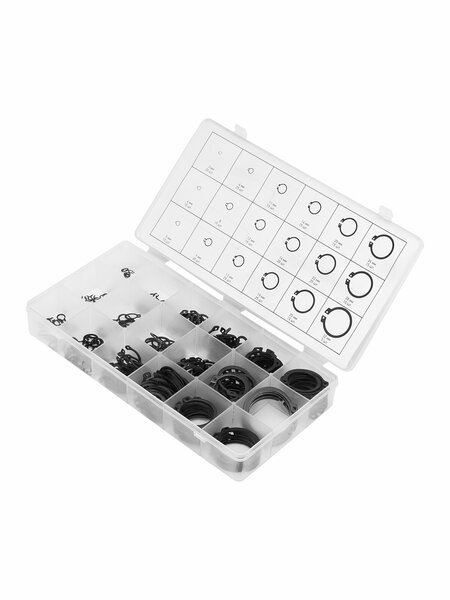 пластиковый кейс- 1 шт ; стопорные кольца: 3 мм - 20 шт; 4 мм - 10 шт; 5 мм - 15 шт; 6 мм - 25 шт ; 8 мм - 15 шт; 9 мм - 20 шт ; 11 мм - 15 шт ; 12 мм - 15 шт ; 13 мм - 25 шт ; 14 мм - 15 шт ; 16 мм - 20 шт; 19 мм - 25 шт; 20 мм - 15 шт; 22 мм - 20 шт; 25 мм - 15 шт; 26 мм - 15 шт ; 28 мм - 10 шт; 32 мм - 5 шт;