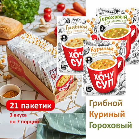 Грибной, куриный и гороховый суп "ХочуСуп" созданы по рецептам стариной русской кухни. Суп с гренками любят дети и взрослые. Готовые супы без варки удобно приготовить в походе или на даче, в поездке или на работе. Залейте кипятком, подождите всего 1-3 минуты, и у Вас готово вкуснейшее ароматное блюдо. Быстыре супы имеют богатый насыщенный вкус. Набор супов ассорти "Хочу Суп" порадует близких и просто выручает. Такая еда - лайфхак в дороге, можно взять в поезд, в путешествие, в командировку, в поездку, на дачу.