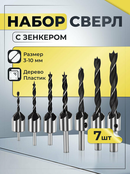 Сверла с зенкерами по дереву позволяют создавать отверстия в материале и обрабатывать их. Насадки такого типа при этом представляют собой небольшие изделия, которые создают углубления для широких креплений. Зенковки для таких инструментов представляют собой сверла с несколькими режущими компонентами, они чаще всего используются для работы с отверстиями конической или цилиндрической формы. Такие металлические элементы позволяют делать разные по типу конфигурации углубления в материале. Также зенковочное сверло часто используется, чтобы немного увеличить диаметр углубления, сделать обработки уже сделанных отверстий. Отличие инструмента с зенковкой от других моделей заключается в том, что для первого варианта используется больше двух лезвий. Набор сверл-зенкеров по дереву включает 7 оснасток диаметром 3-10 мм. Преимущества Прочность и износостойкость — сверла изготовлены из инструментальной стали и закалены. Коррозионная стойкость — оксидированное покрытие защищает сверла от ржавчины. Высокое качество работ — благодаря дополнительным резцам отверстия получаются ровными и чистыми. Быстрый поиск нужной оснастки — на каждое сверло нанесена маркировка, соответствующая диаметру отверстия. Цилиндрический хвостовик — сверла совместимы со стандартными патронами дрелей. Комплектация 7 сверл с зенкером, 1 ключ