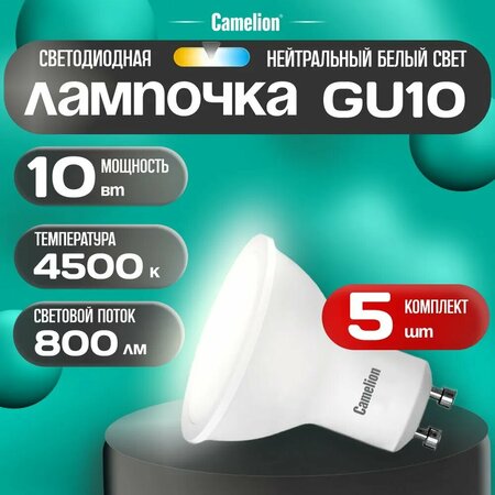 Набор светодиодных лампочек Camelion LED 10W GU10 4500K представляет собой высококачественное и энергоэффективное решение для освещения вашего дома. Произведенные в России, эти лампочки обеспечивают долгий срок службы и стабильную работу. Мощность каждой лампочки составляет 10 Вт, что позволяет им обеспечивать яркое и равномерное освещение. Напряжение в диапазоне 170-265 В делает их подходящими для использования в большинстве домашних электросетей. Световой поток каждой лампочки составляет 800 Лм, что обеспечивает яркое и комфортное освещение. Цветовая температура лампочек составляет 4500К, что соответствует дневному свету. Форма колбы лампочек - рефлектор, что обеспечивает равномерное распределение света. Цвет колбы - белый, а индекс цветопередачи составляет 80+, что гарантирует высокое качество цветопередачи. Угол светового пучка составляет 100°, что обеспечивает широкий охват и равномерное освещение. Лампочки имеют цоколь GU10 и степень пылевлагозащиты IP20, что делает их надежными и безопасными для использования в домашних условиях. В комплекте вы получаете 5 лампочек, что позволит вам полностью обновить освещение в вашем доме.