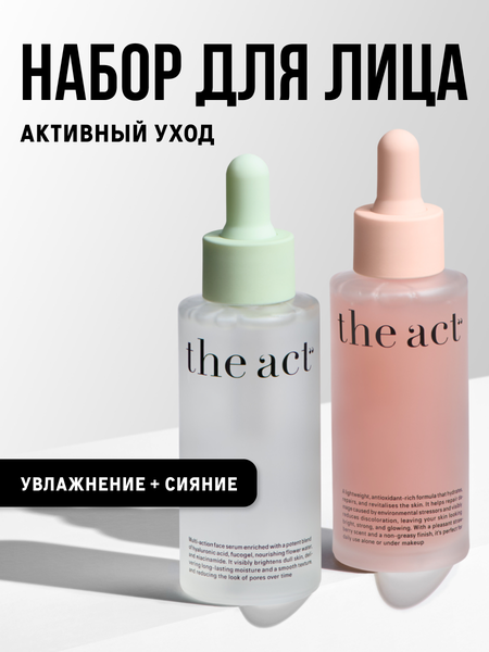 Набор сывороток для лица The Act сочетает в себе действенные формулы, идеально дополняющие друг друга. В составе каждого средства активные компоненты, которые работают в синергии, позволяя добиться максимального эффекта. Раскройте естественную красоту кожи, подарив ей увлажнение и естественное сияние. Главная по увлажнение – сыворотка The Act с тремя видами гиалуроновой кислоты и витамином С. Гиалуроновая кислота в низкомолекулярной форме устраняет обезвоживание, среднемолекулярная улучшает эпидермальное увлажнение, а высокомолекулярная создает защитный барьер, предотвращающий потерю влаги. Витамин C повышает выработку коллагена и выравнивает тон кожи. В ответе за сияние и ровный тон – сыворотка для лица The Act с аминокислотами, гиалуроновой кислотой и растительными экстрактами. Компоненты улучшают цвет лица, стимулируют обновление клеток и защищают кожу от негативного воздействия окружающей среды. Ниацинамид в уходовой косметике восстанавливает и обновляет, способствует сохранению влаги и разглаживанию морщин, помогает от пигментных пятен на лице. Как использовать сыворотки, чтобы добиться максимального эффекта? Каждое средство подходит для самостоятельного использования и дополнит ваш ежедневный уход в любое время. Сыворотки можно сочетать между собой для того, чтобы усилить эффект от их нанесения. Начните утренний уход за лицом с сыворотки для сияния. Нанесите ее на предварительно очищенную кожу. Средство подойдет в качестве легкой основы под макияж. Идеально для жирной кожи, а обладательницам кожи сухого типа лучше сочетать эту сыворотку со своим ежедневным кремом. Увлажняющая сыворотка усилит эффект вечернего ухода. Нанесите средство на предварительно очищенную кожу на несколько минут, затем переходите к следующим этапам ухода. Сыворотка не оставляет липкости, а для того, чтобы усилить эффект увлажнения – добавьте несколько капель в крем. Для максимального эффекта используйте сыворотки ежедневно. Результат — ровная по тону, увлажненная и сияющая кожа. Рекомендованы к применению с 14 лет.