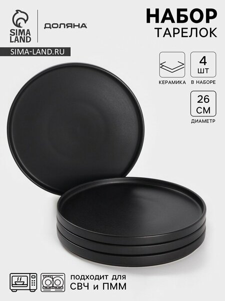 Стильный комплект из четырёх плоских тарелок чёрного цвета. Минималистичный дизайн подчеркнёт презентабельность любого блюда, а 26 см диаметра легко вместят полную порцию. Практичность и удобство Выдерживает высокие температуры — подавайте горячие блюда без опасенийМатовая керамическая поверхность не бликует и скрывает мелкие следы от пальцевПодходят для разогрева в микроволновке и мытья в посудомоечной машинеЧёрный цвет остаётся насыщенным после многократного использования Для кого Четыре одинаковые тарелки решают вопрос сервировки для семьи или небольшой компании. Гладкая текстура на ощупь приятнее обычной керамики. когда хочется простого, но выразительного оформления стола — этот комплект работает идеально.Универсальное решение для повседневных обедов и праздничных ужинов. Сочетается с посудой большинства цветов, не перебивая внимание с основного блюда.