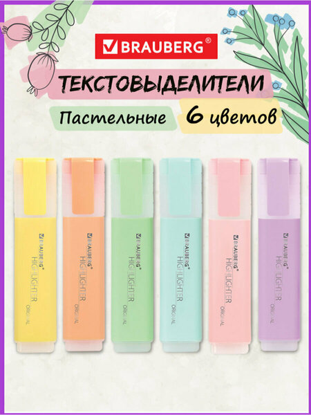 Набор текстовыделителей BRAUBERG "ORIGINAL PASTEL" — идеальный выбор для тех, кто ценит качественную канцелярия. Эти маркеры выделители подойдут для работы в офисе и дома. В набор входят шесть пастельных цветов, таких как ванильный, мятный, пастельный розовый, персиковый, лавандовый и бирюзовый, что делает их отличным инструментом для выделения текста на бумаге любого типа, включая факс-бумагу. Скошенный наконечник текстовыделителей позволяет варьировать толщину линии письма от 1 до 5 мм, что особенно удобно при работе с мелким шрифтом или таблицами. Водная основа чернил предотвращает их высыхание без колпачка в течение 8 часов, а также обеспечивает экономный расход – длина линии письма достигает 300 метров. Эти фломастеры отлично подойдут и для рисования, благодаря мягким пастельным оттенкам, которые создают плавные переходы и равномерно выделяют текст. Цвет клипа и корпуса соответствует цвету чернил, что облегчает использование. Быстрое впитывание чернил предотвращает размазывание, делая этот набор незаменимым среди офисных принадлежностей. • Цвет чернил: ассорти. • Количество в комплекте: 6 шт. • Форма наконечника: скошенный. • Спецэффект цвета чернил : пастельный. • Основа чернил: водная. • Серия: Original. • Мин. толщина линии письма: 1 мм. • Макс. толщина линии письма: 5 мм. • Форма корпуса: плоская. • Диаметр корпуса: 25 мм. • Наличие клипа: да. • Упаковка: ПВХ чехол с подвесом. • Артикул производителя: 151698.