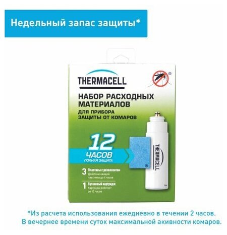 Набор расходных материалов для приборов Thermacell — комплект из 3-х пластин и 1 газового картриджа. Этот набор запасных картриджей Thermacell подходит ко всем приборам. Одна пластина Thermacell обеспечивает защиту от комаров на протяжении 4 часов. Один картридж Thermacell обеспечивает работу прибора на протяжении 12 часов. Прибор незаменим для тех, кто собирается провести выходные на свежем воздухе. Оригинальные запасные наборы Thermacell эффективно отпугивают комаров, создавая зону защиты в 20 кв. м. При этом ресурс картриджей и пластины от комаров не обязательно расходовать за один раз. Если нужно защиту от комаров «поставить на паузу», выключите прибор и уберите пластину обратно в упаковку. Набор запасной Thermacell refills – это пластины от комаров без запаха. Активным ингредиентом пластин является аллетрин — искусственно синтезированный природный инсектицид. Он безопасен для детей, аллергиков и домашних животных. Кстати, Thermacell – это лучшие пластины от комаров, и как показывает практика, они обычно действуют еще и как пластины от мух и комаров. Чтобы понять действие прибора Thermacell, представим известные всем пластины от комаров Раптор или пластины от комаров Тайга, или пластины от комаров Чистый дом – кто с чем сталкивался. Все они вставляются в домашний фумигатор от комаров пластины нагреваются и с поверхности испаряют репеллент, который отпугивает комаров. Принцип работы Thermacell тот же. Пластины нагреваются и испаряют репеллент. Но концентрация репеллента гораздо выше, поэтому прибор с легкостью обеспечивает защиту именно на открытом воздухе. Чем не могут похвастаться домашние фумигаторы. Если вы проводите на открытом воздухе более 12 часов – обратите внимание на набор запасных картриджей Thermacell 4 картриджа и 12 пластин. Которые обеспечат вам 48 часов, абсолютного отдыха, в том числе от комаров. Не забывайте купить пластины от комаров, перед выездом за город.