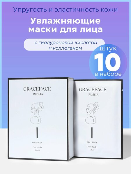 Набор тканевых масок для лица GRACEFACE с коллагеном и гиалуроновой кислотой 10 шт, 250 г в упаковке. В состав масок для лица грейс фейс тканевых входят следующие рабочие компоненты, за счет чего они оказывают реальное действие на кожу: · Коллаген – способствует регенерации клеток кожи, омолаживает, заживляет, подтягивает. · Гиалуроновая кислота- препятствует испарению влаги с кожи, улучшает ее структуру, уменьшает мелкие морщины, делает кожу гладкой и нежной. · Аллантоин- интенсивно увлажняет даже самую сухую кожу, способствует сужению пор и нормализации выработки кожного сала, обладает противовоспалительными свойствами и успокаивает раздраженную кожу. Основные эффекты от применения тканевых масок для лица: · Способствуют обновлению клеток кожи, · Оказывает антивозрастное действие, · Помогают избавиться от отеков и следов усталости, · Глубоко увлажняют и придают здоровый вид коже, · Улучшают эластичность кожи. Маски для лица GRACE FACE имеют очень удобное лекало, их легко наносить. Набор масок для лица тканевых упакован в красивую подарочную коробку. Оптимальнее всего увлажняющие маски для лица подходят для сухой кожи, но также и для всех остальных типов кожи: для проблемной, нормальной, жирной, комбинированной, чувствительной.