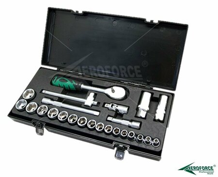 Набор торцевых головок AEROFORCE: 24 предмета в кейсе Комплектация и функциональность Набор торцевых головок AEROFORCE включает в себя 24 предмета, упакованных в удобный кейс. В комплект входят 17 торцевых головок с посадочным квадратом 3/8", 2 торцевых головки для свечей зажигания, 2 удлинителя 3/8", 1 трещотка, 1 карданный шарнир и 1 раздвижная Т-образная планка. Торцевые головки имеют 6-гранный наконечник и размеры от 6 до 22 мм, что позволяет работать с различными видами крепежа. Удлинители и трещотка обеспечивают удобство работы в труднодоступных местах. Карданный шарнир и раздвижная Т-образная планка расширяют возможности использования набора. Зеленый цвет кейса и его компактные размеры (400x180x80 мм) делают набор удобным для хранения и транспортировки. Вес набора составляет всего 2,5 кг, что делает его легким и удобным для использования. Выбирая набор торцевых головок AEROFORCE, вы получаете качественный и функциональный инструмент, который станет незаменимым помощником в ремонте и обслуживании автомобиля.