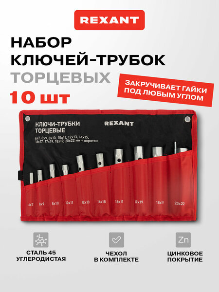 Для закручивания и раскручивания детали применяется внешнее усилие, создаваемое двусторонними торцевыми ключами-трубками REXANT. С обеих сторон инструмента расположены захваты различных размеров для универсального применения. Кольцевой захват оснащен 6 гранями, благодаря чему улучшается сцепление с крепежом и уменьшается риск повреждения граней механизма. Углеродистые стальные захваты №45 защищены от коррозии, закалены до вязкой твердости 41 HRC, препятствуют преждевременному разрушению рабочей части, позволяют производить работу без предельных усилий. Ручной инструмент обеспечивает упрощенный монтаж резьбовых креплений, даже если болты размещены в углублениях (в трудном доступе). Набор ключей-трубок торцевых: 10 предметов Размеры ключей: 6х7, 8х9, 10х11, 12х13, 14х15, 16х17, 18х19, 20х22 мм + вороток в комплекте