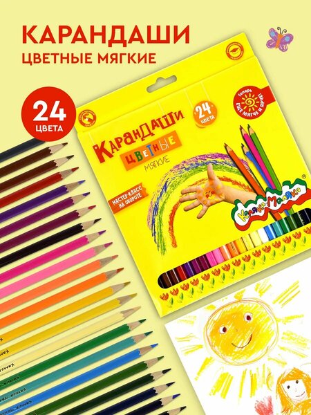 Цветные карандаши набор 24 цвета Каляка-Маляка имеют утолщенный ударостойкий грифель 3 мм повышенной мягкости и яркости. Детские мягкие цветные карандаши для рисования приятно наносятся на бумагу - однородно и равномерно, ярко и насыщенно. Разноцветные карандаши для детей изготовлены из древесины - липы высокого качества, они абсолютно безопасны. Яркие цветные карандаши с мягким грифелем при заточке не крошатся и не ломаются. Карандаши подходят для юных художников - без усилий легко ложатся на бумагу, оставляя яркий цвет, устойчивый к выцветанию. Шестигранные деревянные карандаши не скатываются со стола. Цветные карандаши для малышей и детского творчества приятно держать в руках - они покрыты лаком, защищающим корпус от высыхания. Художественные цветные карандаши для малышей позволят ребенку проявить свои способности и полюбить рисование! Цветные карандаши для школы и детского сада рекомендованы педагогами для творческих занятий. В наборе цветных карандашей 24 цвета - эта широкая палитра поможет малышу развивать восприятие цвета. Набор для рисования из 24 разноцветных карандашей - это отличный подарок для ребенка, для девочки и для мальчика на день рождения, новый год, 23 февраля или 8 марта. Простые карандаши для школы имеют самые базовые цвета. На обороте детских цветных карандашей есть небольшой мастер-класс для малышей. С цветными карандашами и канцелярскими товарами для детей Каляка-Маляка творить всегда в удовольствие! Отличный подарок на новый год