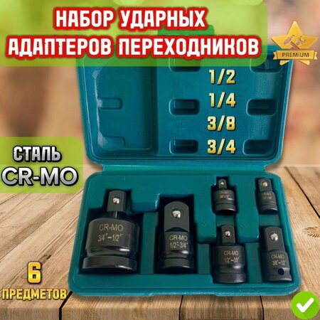 Адаптеры для торцевых головок переходники 3/4 1/2 3/8 1/4 ударные в кейсе. Адаптеры переходные для торцевых головок применяется в случае, когда торцевая головка или другая подобная оснастка отличается от посадочного квадрата инструмента. Адаптеры изготовлены из стали, что увеличивает надежность и срок службы оснастки. Переходники подходят для пневмогайковертов, шуруповертов. Набор состоит из : Адаптер 1 шт - 1/4" (F)x3/8" (M); Адаптер 1 шт - 3/8" (F)x1/4" (M); Адаптер 1 шт - 3/8" (F)x1/2" (M); Адаптер 1 шт - 1/2" (F)x3/8" (M); Адаптер 1 шт - 1/2" (F)x3/4" (M); Адаптер 1 шт - 3/4" (F)x1/2" (M); Пластиковый кейс. Комплектация: Набор насадок для гайковёрта, переходных адаптеров для торцевых головок, 6шт в кейсе. Материал: Cr-MOПокрытие из черного оксида премиум-класса обеспечивает максимальную защиту инструмента от ржавчины и коррозии. Нанесена маркировка размера для быстрой идентификации характеристик и размеров сокетов. В комплект входит прочный пластиковый ящик для хранения для удобной организации и хранения головок. Включены наиболее часто используемые размеры. Данный набор подходит для широкого спектра слесарных работ ( для ремонта автомобиля, мотоцикла, квадроцикла и других транспортных средств ) , для дома и дачи. Переходник для торцевой головки.