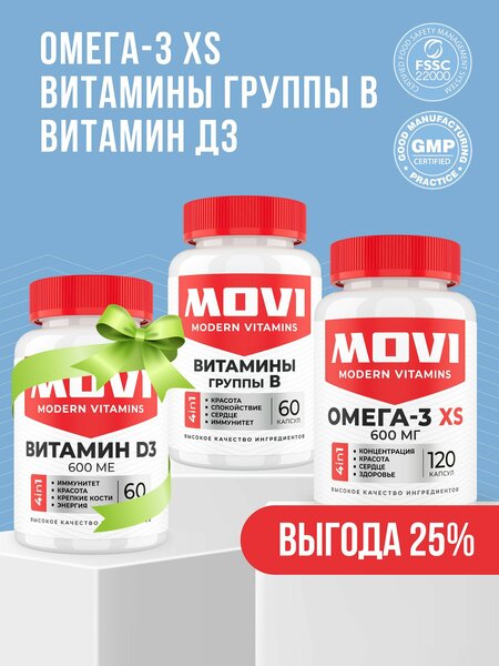 MOVI Набор витаминов 004: Витамины группы В - 60 капсул массой 460 мг. Омега 3 xs-120 капсул массой 680 мг. Витамин Д3 600 МЕ-60 капсул массой 250 мг.