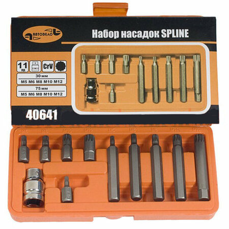 Набор звездочек вставок автодело применяется для работы со специфическим крепежом имеющим рабочий профиль внутренний 12-ти гранный Spline. --- Размеры вставок: L=30 мм - М5, М6, М8, М10, М12. L=75 мм - М5, М6, М8, М10, М12. --- Вставки изготовлены методом холодной штамповки из инструментальной стали S2. --- Закалены до твёрдости 55-60 HRC --- Имеют наружный 12-ти гранный рабочий профиль Spline. --- Наборы укомплектованы переходной головкой с квадрата 1/2" на шестигранник 10 мм. --- Переходник изготовлен из инструментальной стали CrV50BV30, закалён до твёрдости 45-47 HRC --- Звездочки защищены от коррозии фосфатированием. --- Поставляются в пластиковом кейсе. Основным преимуществом данного набора является компактность размеров упаковки и сбалансированный состав набора, в который включены только самые необходимые и востребованные размеры. Благодаря тому что инструмент собран в набор, исключается потеря отдельных комплектующих, как часто бывает при хранении инструмента россыпью.
