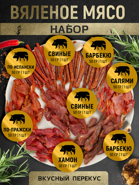 Погрузитесь в мир насыщенных вкусов с нашим набором вяленого мяса из свинины и классических колбасок — идеальной закуской к пиву, вину или просто для сытного перекуса! Это не просто вяленое мясо, это хрустящие свиные чипсы, которые тают во рту, даря взрыв натурального вкуса. Набор вяленого сушеного мяса и колбасок из свинины — ваш новый фаворит среди снэков! - Мясные снеки джерки премиум-класса: Тонкие ломтики вяленого свиного мяса, приготовленные по традиционной технологии медленной сушки. Никакой лишней химии. - Идеальная закуска: Хрустящие мясные чипсы заменят вредные снеки — они подчеркнут вкус пива или крафтового эля, а еще отлично сочетаются с бокалом красного или белого вина! - Свиные сыровяленые чипсы, которые заряжают энергией: В каждой порции — максимум белка и минимум калорий. Берите в дорогу, офис или на тренировку — мясо вяленое не займет места, но утолит голод на 100%. - Удивите гостей: Добавьте джерки мясные и свиные колбаски в сырную тарелку, нарезку или подайте как изысканный аппетайзер. Попробуйте и убедитесь: Это не просто мясо — это гастрономическое наслаждение в каждом кусочке! Закажите сейчас и превратите обычный вечер в пиршество вкуса! Наш набор колбасок и вяленого мяса из свинины — ваша новая зависимость, о которой не придется жалеть!