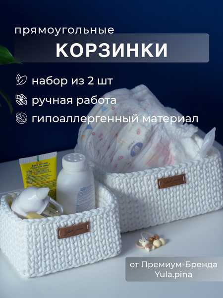 Набор корзин ручной работы для порядка и декора от зарегистрированного бренда Yula.pina. Вязаный органайзер выполнен из современных материалов – прочных и спокойных к влаге и пыли. Практичный и необычный подарок на день рождения, выпускной, новоселье или просто в качестве комплимента. Такой не купишь в магазине, он единственный в своем роде. Приятные эмоции от корзиночек появятся уже на этапе распаковки. Сами плетеные корзины для хранения мелочей идеально впишутся в интерьер. Они - на деревянном донышке с защитой (c внутренней стороны) поэтому их можно использовать и во влажных помещениях - в ванной комнате в том числе (главное, не в местах постоянной влаги во избежание деформации дна). Текстильные корзиночки подойдут для хранения средств личной гигиены, косметики, кистей – в спальне или гостиной. Или для хранения в прихожей или детской для аксессуаров для новорожденных, которые всегда нужны под рукой. Интерьерные корзинки - идеальный подарок любимой, коллеге, подруге. Также можно вручить сестре, учителю, маме. Материал стенок - полиэфирный шнур, гипоаллергенный материал премиум качества, с него легко смывается грязь и пыль, долговечный, при этом приятный на ощупь. Дно - обработанное пресованное дерево толщиной 3 мм. В наборе 2 прямоугольные корзины. Размеры большой - 21/17 см, высота 10 см, маленькой - 16/11, высота 9 см. Натуральная цветовая палитра.*оттенок может немного отличатся из-за настроек экрана.