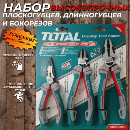 Набор высокопрочных плоскогубцев бокорезов и длинногубцев TOTAL 3 шт. Набор усиленных плоскогубцев, длинногубцев и бокорезов TOTAL 3 шт. (THT2K0301S) предназначен для выполнения монтажных и ремонтных работ различного уровня сложности. Инструменты изготовлены из хромованадиевой стали, что обеспечивает их повышенную прочность на 30% по сравнению с обычными шарнирно-губцевыми инструментами. Двухкомпонентные нескользящие рукоятки из термопластичной резины обеспечивают надежный и удобный захват инструментов, предотвращая их случайное выскальзывание из рук. В комплект входят три инструмента: плоскогубцы длиной 200 мм, длинногубцы длиной 160 мм и бокорезы длиной 180 мм. Инструменты имеют изогнутые, удлиненные прямые и прямые губки, что позволяет выполнять различные виды работ, такие как резка, зачистка, обжим и другие. Вес набора составляет всего 0,75 кг, что делает его легким и удобным для переноски и хранения. Набор инструментов TOTAL выполнен в стильном бирюзовом цвете, что придает ему современный и профессиональный вид.