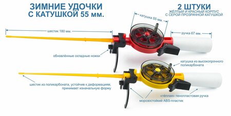 Зимние удочки пирс 55 АБС. 2 штуки. Цвет катушек - дымчатый серый, цвет корпуса - красный и жёлтый. На протяжении многих лет, это одна из самых востребованных удочек для зимней рыбалки в России. По многочисленным просьбам наших покупателей, мы обновили ножки для установки удочки, теперь они складываются под корпус и имеют отверстие для хранения шестика. В набор входит две удочки разных цветов со средней ручкой. Диаметр катушки - 55 мм. Лёгкие, надёжные, удобные, "тёплые" в руке и простые в обращении удочки. Сверху расположена кнопка-стопор. Корпус изготавливается из импортного АБС-пластика и обладает отличной надёжностью в любую погоду. Катушка и шестик изготовлены из прочного и морозостойкого поликарбоната, не имеющего остаточной деформации. "Тёплая" ручка из пенопласта, не впитывающая воду имеет длину 67 мм. Данные удочки более 20 лет выпускаются нашей компанией и имеют отличную репутацию на рынке!