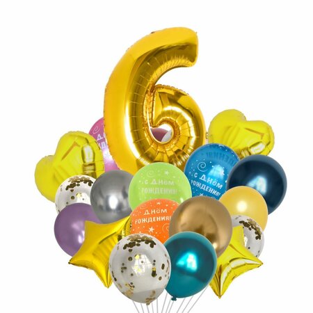 Набор/букет воздушных шаров С днем рождения с цифрой "6" золото. 21 штука