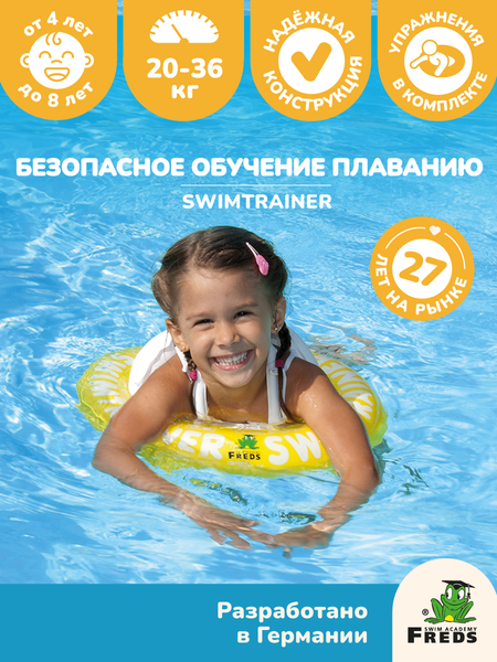 Немецкий бренд FREDS SWIM ACADEMY представляет SWIMTRAINER «Classic» – надувной детский круг для обучения плаванию! Гарантия – 6 месяцев. Круг SWIMTRAINER «Classic» в жёлтом цвете – третий и заключительный этап системы обучения – создан для детей от 4 до 8 лет, которым требуется наименьшая помощь в воде. Рекомендуемый вес – от 20 до 36 кг. Оригинальная конструкция из 5 надувных камер обеспечивает поддержку и безопасность. Боковые камеры и ремешки удобно закрепляются – в круге для плавания ваш ребёнок под защитой: не выскользнет и не перевернётся. - Основная задача – переход малыша к самостоятельному плаванию. - Размер надувных камер – самый маленьких из всех. Для свободной координации движений руками и движений ногами! - Обеспечивает верное горизонтальное положение. - Ребёнок самостоятельно передвигается в воде. Родителям – легче! - Специальные обучающие упражнения – в комплекте! - Нескользящий прочный материал (ПВХ). - Идеальный вариант для отдыха на воде или бассейна. Научиться плавать со SWIMTRAINER – просто. Удовольствие от глубокой воды и в 4 года, и в 5 лет, и в 6, и на всю жизнь!