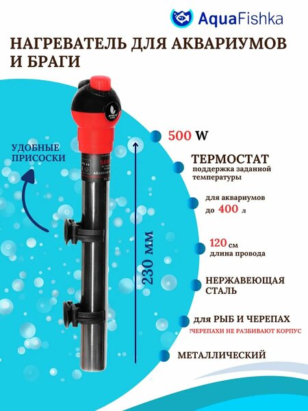 Нагреватель для аквариума 500 Вт. Обогреватель для аквариумов соответственно до400 литров. Полностью погружаем, удобная регулировка температуры, высокая точность поддержания температуры, не превышающей плюс/минус 1 C, сигнальная лампа, простое обслуживание. обогреватель для аквариума, терморегулятор для аквариума. Для более равномерного прогрева всей толщи воды его следует установить в месте, где проходит течение (например, возле выхода воды из фильтра). Обогреватель необходимо подключать к розетке только после того, как он будет полностью погружен в воду. Обязательно отключайте его от сети при обслуживании аквариума. Перед тем, как достать устройство из воды, дайте ему остыть. Нагреватель воды для аквариума подходит для любых гидробионтов: рыбок, черепах, креветок, раков, крабов, аксолотлей и т. д. Колба обогревателя выполнена из высококачественного стекла. Обогреватель для аквариума полностью погружается в воду, все его компоненты надежно загерметизированы. Нагреватель воды для аквариума подходит для любых гидробионтов: рыбок, черепах, креветок, раков, крабов, аксолотлей и т. д.