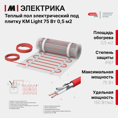 Электрический тёплый пол Нагревательный мат КМ - Light с поверхностной мощностью тепловыделения 150 Вт/м2. Нагревательный мат с двухжильным экранированным кабелем, закреплённым на стеклосетке, что даёт равномерный шаг укладки и равномерное распределение тепла по поверхности, исключая эффекта «зебры». Теплый пол монтируется в раствор (клей) для крепления плитки или керамогранита либо в песчаную стяжку при укладке под ламинат, паркет и любые другие напольные покрытия. Нагревательный мат предназначен для комфортного обогрева. Наружный диаметр нагревательного кабеля всего 4,3 мм. Производитель тёплого пола оставляет за собой право менять цвет стеклосетки, на которой закреплён кабель, с сохранением качества товара и всех заявленных характеристик. Произведено в России. Гарантия на тёплый пол – 15 лет