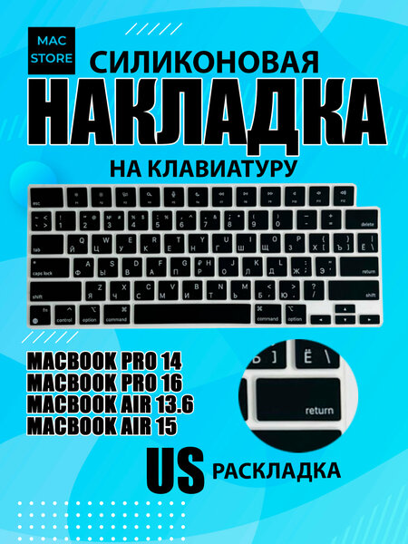 Накладка на клавиатуру с Американской раскладкой с гравировкой для MacBook Pro 14 / 16 M1 M2 M3 (Модель: A 2992 A2442 A2779 A2485 А2780 A2991 A2918) MacBook Air 13 / 15 M2 M3 2023 2024 (Модель: A2681 A2941 A3113 A3114) 1 шт. Позволяет защитить клавиатуру MacBook от отпечатков пальцев, накопления пыли и потертостей. Ультратонкий дизайн не вызывает дискомфорт при работе, а благодаря качественным материалам пальцы не скользят во время набора текста. Накладка легко устанавливается и никак не влияет на скорость печати или размеры клавиатуры. На накладку нанесена гравировка, полностью схожая с клавиатурой Вашей модели MacBook Модель изготовлена специально для MacBook в котором использована американская раскладка прямоугольный Enter Благодаря небольшой толщине материала, накладка не утяжеляет дизайн ноутбука и практически не ощутима на клавиатуре. *Рекомендуем не оставлять накладку в закрытом MacBook во избежании дополнительного давления на экран! Совместимость устройств: MacBook Pro 14 / 16 M1 M2 M3 M4 (Модель: A2442 A2779 A2485 А2780 A2992 A2991 A2918 A3401 A3185 A3112 A3403 A3186) MacBook Air 13 / 15 M2 2023 (Модель: A2681 A2941) Внимание! Перед покупкой обратите внимание на американский вариант клавиши Enter, она прямоугольная, у европейского варианта клавиша Enter Г-образная. В упаковке 1 шт.