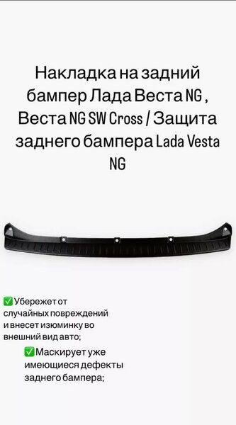 Защитная накладка на задний бампер новой Лада Веста NG (выпуск после 2022 г.) в любом кузове: Седан, SW Универсал и CROSS. Предназначена для защиты лакокрасочного покрытия заднего бампера от сколов и царапин при погрузке/выгрузке и при перевозе длинномеров или негабаритов. Выполнена из качественного чёрного АБС-пластика. Простая установка! Отличный внешний вид! Простая установка: Крепится 5-ю штатными винтами бампера и с помощью скотча 3М (уже нанесен на тыльную сторону накладки). Установка простая и быстрая: Открутите 5 штатных винтов крепления бампера Примерьте накладку. Обезжирьте поверхность прилегания на бампере, снимите защитную пленку со скотча, приклейте накладку (рекомендуем «центровать» накладку незакрученными до конца болтами), Закрутите обратно 5 штатных винтов крепления бампера Установку рекомендуется выполнять в сухом и теплом помещении. Комплект поставки : Защитная накладка заднего бампера Лада Веста NG 2022 - 1 шт.