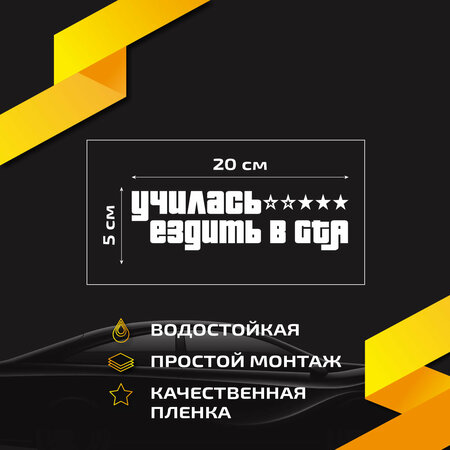 Прикольные надписи - подойдут в подарок или на свою машину, ноут, технику. Наклейка на машину надпись Учился (Училась) ездить в GTA размер 20х5 см расскажет окружающим о Ваших исключительных навыках вождения автомобиля. Изготовлена из виниловой пленки Oracal 641, что гарантирует качественное приклеивание к гладкой поверхности, защиту от выцветания до 3 лет. Прикольная виниловая наклейка без фона будет круто смотреться на вашем авто и ноутбуке, чемодане и мотоцикле, ее можно использовать для творчества делая тюнинг автомобиля создав уникальный прикольный стиль или как предупреждающий знак. Надписи на машину клеят на переднее боковое стекло автомобиля, но подойдёт и заднее стекло, кузов, дверь, бампер. Может использоваться как интерьерная наклейка декор на ноутбук, зеркало, стеклянную дверь, холодильник. Автонаклейка легко снимается не оставляя следов. Как клеить наклейки подскажет инструкция в фото к карточке товара. VinilLab расширяет ассортимент добавляя модные, яркие виниловые наклейки заботясь о качестве товара и макетов, работая с Вашими отзывами. Добавляйте магазин в избранное, чтобы следить за обновлением ассортимента. На данный момент в ассортименте представлены: Герб РФ, хэш теги, прикольные надписи, ребенок в машине, символ Z (зет, зэд) олицетворяющий специальную операцию, Питбуль, Ведьма, Иероглифы.