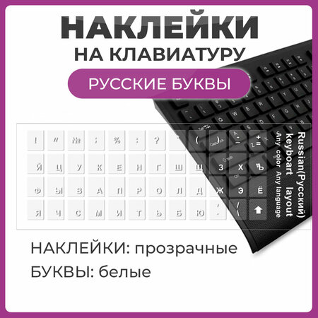 Наклейки на клавиатуру с русскими буквами, основа прозрачная, буквы белые размер 11х13 мм