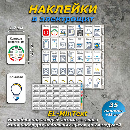 Маркировка для электрощитов + отдельные слова для подписания, с очень понятными пиктограммами в формате отдельных наклеек на щит под каждый автомат сделанных в едином стиле. Универсальной электромаркировкой легко подписать электрощит в квартире и доме, а так же внести дополнения и изменения в процессе эксплуатации щита! Наклейки в электрощит не требуют предварительной подготовки, компьютер, принтер, только универсальные наклейки на щит, канцелярский нож (есть видео пример как правильно клеить наклейки на электрощит) несколько минут свободного времени. Наклейки на электрощиток высокого качества, водостойкие, устойчивы к бытовой химии. Пиктограммы для автоматов в щите - разберётся даже ребенок! Маркировка автоматов в электрощите каждый раз экономит время для поиска необходимого автомата!