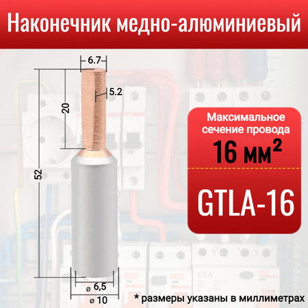Наконечник медно-алюминиевый GTLA-16, штыревой, для оконцевания проводов и СИП кабелей сечением до 16 мм2. Аналог КВТ 81985 ншам 16, КВТ 82234, НСА-16, DTLC 16, GTLC 16, DTA 16. Используется для присоединение алюминиевых кабелей и проводов к автоматическим выключателям и распределителям электрической энергии. Наконечник GTLA-16 обеспечивает надежное подключение многожильных и одножильных алюминиевых проводов СИП (и иных) к клеммам автоматов. Присоединение наконечника GTLA-16 к кабелю СИП происходит путем опрессовки.