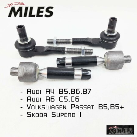 Комплект рулевых наконечников +рулевые тяги. Фирма: MILES — динамично развивающийся бренд, известный с 2000 года. Компания представляет на автомобильный рынок широкий ассортимент автомобильных запасных частей, обеспечивая миллионы автовладельцев качественными деталями для надежной и комфортной эксплуатации легковых и коммерческих автомобилей. Родина бренда: Бельгия. Применимость: Audi A4 B5 (8D) 1994-2000г; Audi A4 B6 (8E) 2000-2004г; Audi A4 B7 (8E) 2004-2008г; Audi A6 C5 (4B) 1997-2005г; Audi ALLROAD C5- 2001-2005г; Audi A8 D2 (4D2, 4D8) 1994-2002г; Volkswagen PASSAT B5 1997-2005г; Skoda SUPERB I (3U) 2001-2008г; Состав комплекта: Наконечник рулевой левый правый MILES DC17162 -2шт; Тяга рулевая левая правая MILES DC39018--2шт;