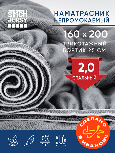 Наматрасник непромокаемый Stretch Jersy - это незаменимый аксессуар для тех, кто ценит комфорт и уют в своем доме. Наматрасник изготовлен из махрового трикотажа с мембранным покрытием TPU (мулетона AQUASTOP). Это обеспечивает водонепроницаемость и защиту верхней поверхности матраса от влаги и грязи. Трикотажный притачной бортик по периметру обеспечивает хорошую фиксацию наматрасника на матрасе. Фирменная резинка повышенной эластичности гарантирует надежное крепление. Наматрасник имеет паропроницаемую мягкую "дышащую" поверхность, пропитанную антибактериальным составом. Это делает его гипоаллергенным и безопасным для использования с малышами. Рекомендуемая температура стирки наматрасника - 60 градусов. Это позволяет сохранить его свойства и внешний вид на долгое время. Непромокаемый защитный наматрасник на резинке с бортами 160х200 см бренда Stretch Jersy. Цвет графит, темно-серый. Двуспальный наматрасник 160*200 с бортом по периметру обеспечивает надежную фиксацию без скольжения. Бортик из эластичной трикотажной сетки — высотой 25 см, максимально растягивается до 32 см и по свойствам не уступает хлопку. Мягкий и при этом плотный чехол на матрас грязе- и водонепроницаемый. Изготовлен из гипоаллергенного антибактериального дышащего материала. Постоянный контакт не вызывает раздражений и дискомфорта. С лицевой стороны приятная к телу впитывающая махровая поверхность из мягкого трикотажа, с изнанки — прочное водонепромокаемое мембранное покрытие TPU, мулетон AQUASTOP аквастоп. Аккуратная и прочная упругая резинка пришита по периметру фирменным швом немецкими нитками. Толстый наматрасник-чехол не сминается во время сна и сохраняет свою первоначальную форму. Легко стирается и прослужит долгое время даже после многочисленных стирок. Рекомендуемая температура стирки 60℃. Двухспальное постельное белье 160 на 200 см как в ikea икеа подходит на 2 спальную кровать, диван и матрас. Рекомендации по выбору размера можно прочитать на изображении в карусели фотографий карточки товара. Это практичный подарок в любой дом для квартиры, дома или дачи на зиму и лето. Важный элемент домашнего текстиля, который не только защитит от износа, но и значительно повысит комфорт вашего сна. Идеален для беременных и для мам с малышами. Может быть использован как непромокаемая простынь на резинке, для защиты мебели от кошек или на топпер. Товар сертифицирован. Производство Россия. Добавляйте наш бренд в избранное, нажав на сердечко, и следите за новинками от производителя. У нас вы найдете качественные товары для спальни. С заботой о вашем крепком, здоровом и комфортном сне, бренд Stretch Jersy. Наматрасник Stretch Jersy имеет размеры 160 х 200 х 25 см, что позволяет использовать его на большинстве стандартных матрасов. Выбирая наматрасник непромокаемый Stretch Jersy, вы получаете надежный и удобный аксессуар для своего матраса, который обеспечит комфорт и защиту от влаги и грязи.