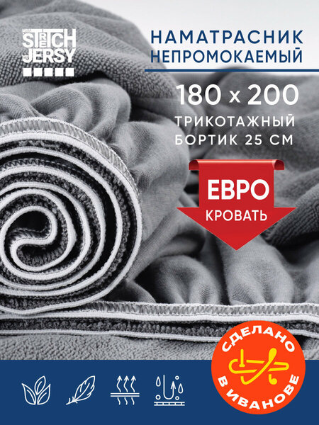 Наматрасник непромокаемый Stretch Jersy - это незаменимый аксессуар для тех, кто ценит комфорт и уют в своем доме. Непромокаемый защитный наматрасник на резинке с бортами 180х200 см бренда Stretch Jersy. Цвет графит, темно-серый. Двуспальный наматрасник 180*200 с трикотажным бортом по периметру обеспечивает надежную фиксацию без скольжения. Бортик из эластичной трикотажной сетки — высотой 25 см, максимально растягивается до 32 см и по свойствам не уступает хлопку. Мягкий и при этом плотный чехол на матрас грязе- и водонепроницаемый. Изготовлен из гипоаллергенного антибактериального дышащего материала. Постоянный контакт не вызывает раздражений и дискомфорта. С лицевой стороны приятная к телу впитывающая махровая поверхность из мягкого трикотажа, с изнанки — прочное водонепромокаемое мембранное покрытие TPU, мулетон AQUASTOP аквастоп. Аккуратная и прочная упругая резинка пришита по периметру фирменным швом немецкими нитками. Толстый наматрасник-чехол не сминается во время сна и сохраняет свою первоначальную форму. Легко стирается и прослужит долгое время даже после многочисленных стирок. Рекомендуемая температура стирки 60℃. Постельное белье 180 на 200 см как в ikea икеа подходит на 2 спальную кровать, диван и евро матрас. Рекомендации по выбору размера можно прочитать на изображении в карусели фотографий карточки товара. Это практичный подарок в любой дом для квартиры, дома или дачи на зиму и лето. Важный элемент домашнего текстиля, который не только защитит от износа, но и значительно повысит комфорт вашего сна. Идеален для беременных и для мам с малышами. Может быть использован как непромокаемая простынь на резинке, для защиты мебели от кошек или на топпер. Товар сертифицирован. Производство Россия. Добавляйте наш бренд в избранное, нажав на сердечко, и следите за новинками от производителя. У нас вы найдете качественные товары для спальни. С заботой о вашем крепком, здоровом и комфортном сне, бренд Stretch Jersy. Наматрасник изготовлен из махрового трикотажа с мембранным покрытием TPU (мулетона AQUASTOP). Это обеспечивает водонепроницаемость и защиту верхней поверхности матраса от влаги и грязи. Трикотажный притачной бортик по периметру обеспечивает хорошую фиксацию наматрасника на матрасе. Фирменная резинка повышенной эластичности гарантирует надежное крепление. Наматрасник имеет паропроницаемую мягкую "дышащую" поверхность, пропитанную антибактериальным составом. Это делает его гипоаллергенным и безопасным для использования с малышами. Рекомендуемая температура стирки наматрасника - 60 градусов. Это позволяет сохранить его свойства и внешний вид на долгое время. Наматрасник Stretch Jersy имеет размеры 180 х 200 х 25 см, что позволяет использовать его на большинстве стандартных матрасов. Выбирая наматрасник непромокаемый Stretch Jersy, вы получаете надежный и удобный аксессуар для своего матраса, который обеспечит комфорт и защиту от влаги и грязи.