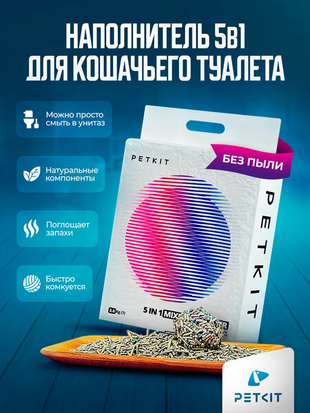 Наполнитель для кошачьего туалета 5в1 Petkit - это комкующийся продукт, который состоит из натуральных ингредиентов и быстро комкуется, не создавая пыли. Это обеспечивает защиту дыхательных органов питомца и всей семьи. Наполнитель 5в1 Petkit обладает низким содержанием влаги, что предотвращает появление плесени. Благодаря этому, наполнитель обеспечивает гигиеничность и свежесть в вашем доме. Продукт имеет объем 6 литров и упакован в пластиковый пакет. Размер упаковки составляет 205*265*75 мм, а вес - 2.65 кг. Гранулы наполнителя имеют диаметр 2 мм и являются мелкими. Основные компоненты наполнителя - тофу, крахмал и активированный уголь. Благодаря этому, наполнитель обладает антибактериальными свойствами, а также является гипоаллергенным и биоразлагаемым. Наполнитель 5в1 Petkit можно утилизировать в канализации, что делает его удобным в использовании.