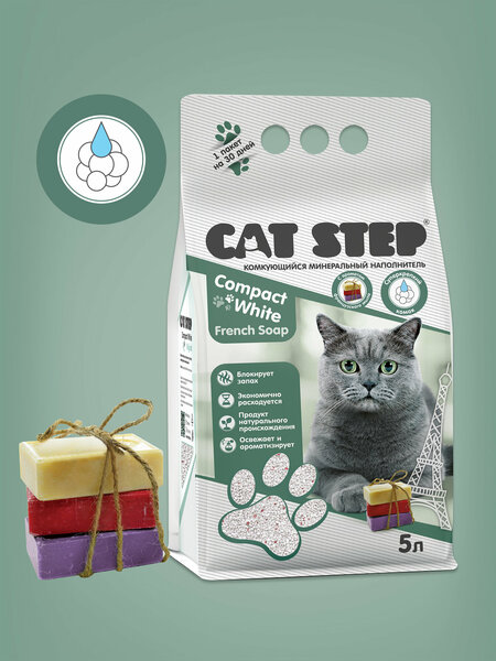 Наполнитель для кошачьего туалета CAT STEP уже второй раз подряд становится победителем престижной национальной премии «Бренд года в России». Мы очень рады получить столь высокую оценку, ведь каждый день наша команда работает для того, чтобы делать хвостиков счастливыми, а их хозяев довольными и спокойными. Почему же, среди многообразия видов наполнителя, все заботливые хозяева выбирают именно минеральный комкующийся CAT STEP? • Минеральный наполнитель, изготовлен из природной белой бентонитовой глины; • Бентонитовая глина - идеальный материал, при контакте с жидкостью она мгновенно формирует твердые комки, предотвращая образование грязи в лотке и эффективно удерживая запахи; • Благодаря оптимальному размеру гранул комки получаются ровные и компактные, что позволяет экономично расходовать минеральный наполнитель, не утилизируя лишнего. • Белая бентонитовая глина не подвергается химическому воздействию, проходит только термообработку и несколько стадий очистки от пыли • Минеральный наполнитель не прилипают к лапкам и шерсти питомца; • Наполнитель безопасен для питомцев и не вызывает аллергии у пушистых; • Обеспыленность наполнителя и оптимальный размер гранул обеспечивает чистоту в зоне кошачьего лотка; • Высокие абсорбирующие свойства наполнителя для кошачьего туалета не дают развиваться бактериям; Приятный и нежный аромат марсельского мыла, который появляется при контакте наполнителя с жидкостью, освежает помещение и создает уютную атмосферу. Позаботьтесь о здоровье и комфорте вашего котика с помощью нашего наполнителя. Для одного питомца содержимого пакета объемом 5л (4,2 кг) хватает в среднем на 1 месяц использования. Размер гранул: 0,6-2,2 мм. Облегчите себе жизнь и создайте комфортное пространство для своих любимцев без лишних хлопот. Рекомендации по использованию: • Заполните сухой и чистый лоток наполнителем CAT STEP Compact White слоем 5-7 см; • Регулярно удаляйте твердые отходы и комочки, при необходимости досыпайте свежего наполнителя; • Рекомендуем использовать лоток с высокими бортами без сетки; •Не выбрасывайте использованный минеральный наполнитель в унитаз.
