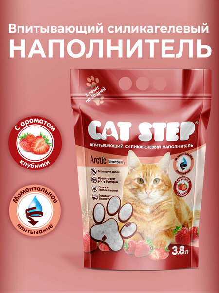 Наполнитель для кошачьего туалета CAT STEP уже второй раз подряд становится победителем престижной национальной премии «Бренд года в России». Мы очень рады получить столь высокую оценку, ведь каждый день наша команда работает для того, чтобы делать хвостиков счастливыми, а их хозяев довольными и спокойными. Почему же, среди многообразия видов наполнителя, все заботливые хозяева выбирают именно силикагелевый CAT STEP? • Наполнитель силикагелевый, благодаря своей пористой структуре гранул, имеет повышенную способность к поглощению жидкости и надежно запирает ее внутри; • Силикагель - идеальный материал, который блокирует запах из кошачьего лотка; • Силикатные гранулы не прилипают к лапкам и шерсти питомца; • Впитывающий наполнитель безопасен для питомцев и не вызывает аллергии у пушистых; • Обеспыленность наполнителя и оптимальный размер гранул обеспечивает чистоту в зоне кошачьего лотка; • Высокие абсорбирующие свойства наполнителя для кошачьего туалета не дают развиваться бактериям; • Не требует постоянного контроля и ежедневной уборки туалета для кошек. Позаботьтесь о здоровье и комфорте вашего котика с помощью нашего наполнителя. Для одного питомца содержимого пакета объемом 3,8л (1,8 кг) хватает в среднем на 1 месяц использования. Облегчите себе жизнь и создайте комфортное пространство для своих любимцев без лишних хлопот. Наполнитель CAT STEP Arctic Strawberry также обладает ароматом клубники. Красные гранулы активируются при контакте с жидкостью, создавая приятный аромат в вашем доме. Рекомендации по использованию: • Заполните сухой и чистый лоток для кошек наполнителем слоем 3-5 см; • Для равномерного распределения свежих кристаллов, перемешивайте наполнитель для кошек и регулярно удаляйте экскременты; • Примерно через 1 месяц удалите использованные гранулы и замените их новой порцией силикагелевого наполнителя; • Не выбрасывайте использованный наполнитель из силикагеля в унитаз.
