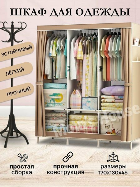 Надевайте, пожалуйста, чехол в начале сборки. Шкаф с тканевым чехлом - идеальное решение для хранения ваших вещей и белья. Превосходный помощник в организации порядка в доме. Удобный и функциональный. Каркас металлический, полностью складной, обтягивается сверху тряпочной материей, которую при необходимости всегда можно легко снять для стирки. Универсальный. Без чехла вы можете использовать его, как стеллаж. Тряпочный чехол защитит вашу одежду от пыли и грязи, сохраняя ее в идеальном состоянии. Оснащен полками и штангой для вешалок. Расположите его в коридор или прихожую, спальню или гардеробную комнату, гостиную или даже балкон. Отличный вариант мебели для съемных квартир, во время ремонта и для путешествий! Максимальная нагрузка на полку 3 кг.