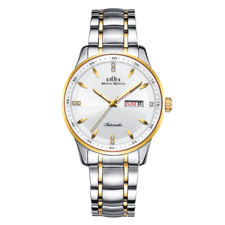 Парная серия часов Mikhail Moskvin Elegance 1789, представленная в двух размерах: 28 мм. - женский вариант и 39 мм. - мужской. В стальной корпус с водозащитой 5 АТМ установлен рельефный циферблат, инкрустированный фианитами. Дополнительные функции дня недели и календаря представлены в лаконичном прямоугольном окошке на значении “3”. За точность показаний фактурных стрелок с люминесцентным покрытием отвечает японский механизм с функцией автоподзавода Miyota. Стальной браслет оснащен практичной застёжкой-бабочкой. Данная модель отлично дополнит деловой или вечерний образ.
