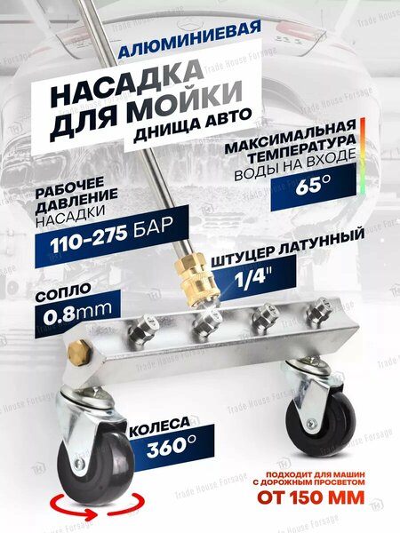 Насадка для мойки днища автомобилей от бренда FORSAGE. Продукция бренда Forsage отличается надежностью, долговечностью и высокой производительностью. Насадка для мойки днища автомобилей от FORSAGE - это идеальное сочетание функциональности, удобства использования и высокого качества материалов, обеспечивающее надежную и эффективную работу. Насадка для мойки днища автомобилей представляет собой удобное устройство, специально разработанное для обеспечения комфортной и эффективной мойки автомобилей. Характеристики: Свободное движение колес на 360 градусов, сопло 0.8 мм. - 4шт, максимальная температура воды на входе 65 градусов, штуцер 1/4", материал: алюминий, нержавеющая сталь, латунь. Рабочее давление насадки составляет 110-275 бар, ширина 33 см, высота 11,9 см, высота над землёй 6,7см, диаметр форсунок 1,35см, расстояние между форсунками 5,9 см, длина трубок 34,7 см, длины изогнутой трубки - 34 и 9,8 см. Мойка днища автомобиля — важная процедура по уходу за транспортным средством. Водители часто забывают о мойке днища автомобиля с низу, которое является одной из самых загрязненных частей автомобиля. Максимальная температура воды на входе составляет 65 градусов, что позволяет использовать насадку с горячей водой для более эффективной мойки. Штуцер насадки имеет размер 1/4", обеспечивая простое и удобное подключение к шлангу. Устройство обеспечивает свободное движение колес на 360 градусов, что значительно упрощает процесс мойки. Сопло насадки состоит из 4 штук, обеспечивая равномерное распределение воды для более эффективной очистки. Подходит для машин с дорожным просветом от 150 мм. Рабочее давление насадки составляет 110-275 бар, что позволяет эффективно удалять грязь и загрязнения с днища автомобиля. Насадка изготовлена из алюминия, что обеспечивает прочность и устойчивость к коррозии. Форсунки насадки выполнены из нержавеющей стали, что гарантирует долгий срок службы и высокую степень надежности.