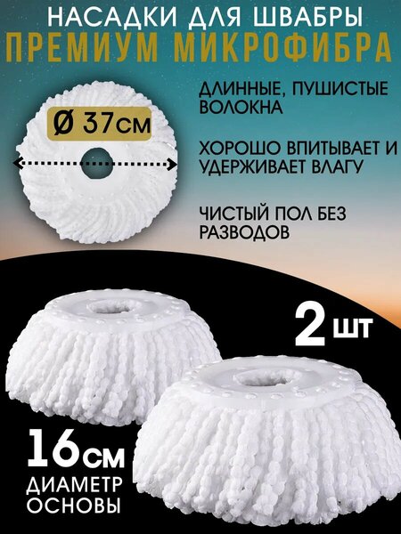 Насадки для швабры из премиальной микрофибры – это универсальное решение для идеальной уборки. Пушистые, длинные волокна эффективно захватывают и удерживают грязь, пыль, волосы и шерсть, а также отлично впитывают грязную воду. Благодаря круговой форме насадка легко проникает в труднодоступные места и обеспечивает качественное очищение любых поверхностей без разводов. Круглые насадки на швабру подходят для большинства моделей, включая насадки на швабру с отжимом круглая и системы с центрифугой. Диаметр основы 16 см обеспечивает плотное крепление и стабильную работу. Мягкая структура ворса бережно очищает паркет, плитку, ламинат, мрамор и даже кузов автомобиля, не оставляя царапин. Особенности и преимущества: Насадка для швабры круглая с диаметром 37 см для большой площади захвата. Премиальная микрофибра отлично удерживает влагу, ускоряя процесс уборки. Подходит для большинства вёдер с центрифугой и систем с отжимом. Легко собирает шерсть, волосы, пыль и мелкий мусор. Можно стирать в машинке без потери формы и свойств. Идеальна для паркета, плитки, ламината, мрамора и стекла. Длинный ворс обеспечивает глубокую очистку и удерживает грязь внутри волокон. Прочный пластиковый держатель для надёжной фиксации. Выбирая насадки на швабру круглые 16см, вы получаете долговечный и многофункциональный аксессуар, который облегчит уборку и сэкономит ваше время. Эти сменные насадки на швабру круглые обеспечивают идеальный результат с минимальными усилиями и подходят для любых задач – от влажной уборки дома до мойки автомобиля. Закажите насадки для швабры круглые с отжимом уже сегодня и оцените комфорт профессиональной чистоты у себя дома!