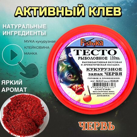 Кукурузное тесто рыболовное 150 мл Fish.Ka высокоактивная вкусовая ароматическая насадка. Готовое к применению. Готовое тесто используется на рыбалке в качестве насадки. Достать из банки небольшой кусочек теста, скатать шар или цилиндр, насадить на крючок и сделать заброс в место ловли. Тесто растворяется в воде, отдавая слой за слоем насыщенные компоненты для привлечения рыб. Можно использовать тесто как связующий материал с добавлением в фидерные кормушки. Из теста можно создавать любые формы насадок, придавать дополнительные свойства, оболочки другим естественным или искусственным насадкам. Тесто всегда свежее и не портится в течении долгого времени. Никаких консервантов. Если тесто стало твердым, его можно смочить маслом подсолнечным и оно станет мягким и ароматным. Фасуется в баночки 150мл.