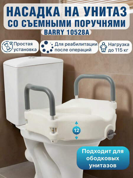 Насадка-сиденье для унитаза после операции 10528А с быстросъемными поручнями делает комфортнее и безопаснее процесс использования туалета. Насадка на унитаз для инвалидов увеличивает высоту сиденья на 12 см, облегчая вставание/посадку и снижая нагрузку на суставы. Туалетная сидушка предназначена для пожилых людей и ослабленных людей. Быстросъемные алюминиевые поручни имеют мягкие накладки, на которые человек может с удобством опереться. Благодаря мягким накладкам исключается прикосновение к холодному и твердому металлу, что дарит комфорт при использовании изделия. Установка и фиксация накладки на унитаз для взрослых проста: изделие фиксируется при помощи одного винта. Сиденье для унитаза со съемными поручнями изготовлено из гигиенического пластика, который легко чистить и мыть. Система фиксации на задней стенке рассчитана на ободок не более 3см. внимание! Сиденье НЕ подходит для безободковых унитазов. особенности унитазной вставки: