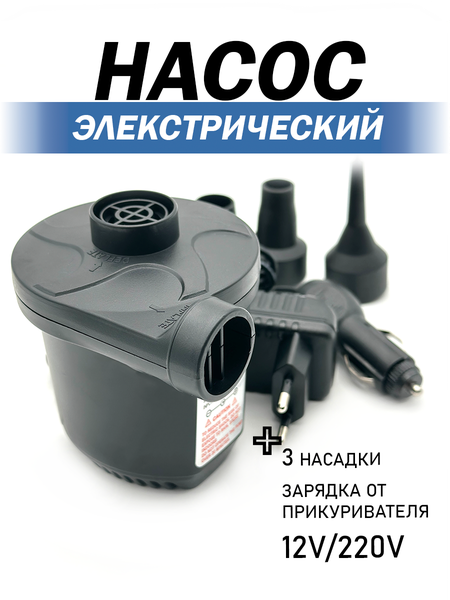 Насос для матраса, электрический, 220V зарядка от розетки, зарядка от прикуривателя 12V, 3 насадки