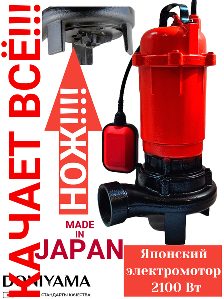 Индустриальный фекальный / канализационный насос с ножом Оснащён японским индустриальным электромотором ( Сделан в Японии) Насос собран на лицензированной фабрике в КНР под контролем японских инженеров Описание Насос дренажный для грязной воды / насос фекальный погружной (канализационный) оснащён усиленным измельчающим ножом измельчителем и стальным рабочим колесом. Дренажный насос для грязной воды предназначен для промышленного применения. Усиленный измельчающий нож насоса фекального погружного перемалывает твёрдые включения ( куски глины, гигиенические средства, остатки биологического происхождения и даже небольшие кости и ветки). Насос дренажный для грязной воды канализационный фекальный предназначен для откачки жидкостей любой загрязнённости вплоть до ила. На фекальный насос установлен промышленный электромотор японского производства, и чугунный корпус ( эффективно отводит тепло от электромотора) что позволяет эксплуатировать дренажный насос для грязной воды фекальный с любой интенсивностью и нагрузками. Фекальный дренажный насос оснащён поплавковым выключателем, что позволяет ему работать в автоматическом режиме. Характеристики: Мощность 2100Вт Параметры сети 220В/50 Гц Напор высота 15 м Глубина подъёма 8 м Производительность 350 л/мин 21 м3/ час Частота вращения 2860 об/мин Диаметр патрубка 50 мм Материал корпуса Чугун Материал измельчающего механизма и рабочего колеса сталь Степень защиты IPХ8 Вес 16 кг мощный 2100ВТ чугунный С ножом-измельчителем DONIYAMA - японские сандарты качества. DONIYAMA это лицензионное производство той самой надёжной японской техники, что радовала потребителей по всему миру в 80-е, 90-е и 2000 – е годы! Под брендом DONIYAMA не производят дешевых копий или тем более откровенных подделок которыми к сожалению в наши дни наполнен рынок. DONIYAMA – это лицензионное производство в строгом соответствии с технологией и под пристальным техническим контролем японских специалистов. Основные комплектующие произведены в Японии. Сборочное производство размещено у проверенных лицензированных подрядчиков выполняющих сборочное производство для японских корпораций. Вся продукция DONIYAMA сертифицирована и полностью соответствует японским индустриальным стандартам. А так как все модели DONIYAMA производятся по лицензии и уже давно окупили затраты на разработку, DONIYAMA предлагает то самое легендарное японское качество, но по доступной цене!