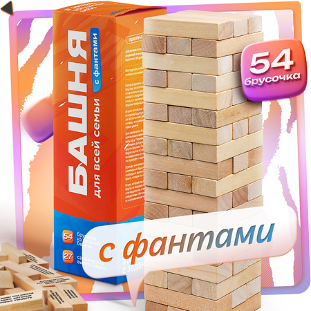 Настольная игра Башня с фантами так популярна во всем мире и увлекательна благодаря простым правилам: после постройки башни из 54 деревянных брусочков игроки должны поочередно доставать блоки из основания башни, выполнять задания (фанты), указанные на них, и класть наверх, делая башню все более высокой и все менее устойчивой. Главная цель игры - извлекать и складывать брусочки так, чтобы не разрушить саму башню. Игрок, извлекший последний брусок, после которого башня упала - проигрывает. Фанты - простые и забавные задания, написанные на каждом брусочке, которые необходимо выполнить перед тем, как уложить его на верх башни. Фанты помогают проявить свои таланты и воображение, отдохнуть от построения башни, стать смелее и раскрепощённее. Совместное выполнение заданий-фантов дарит дополнительные позитивные эмоции. Игра (типа дженги) с фантами предназначена для всех возрастов 6+, в неё могут играть дети и взрослые, родственники, друзья и коллеги, играть можно вдвоём, а можно большой компанией. Для этой деревянной игры не нужно никаких дополнительных условий, за счет компактной упаковки ее удобно взять с собой в поездку или для игры в гостях или в офисе. Играть в Башню с фантами не только весело и интересно, но и полезно: игра объединяет участников, способствует приобретению навыков работы в команде, вырабатывает чувство баланса, аккуратность, ловкость, терпение, смекалку, креативность, развивает мелкую моторику. Настольная игра Башня с фантами - отличный подарок на день рождения или корпоратив.