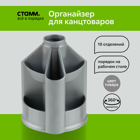 Настольная подставка "Mini Desk" от Стамм - это практичный и стильный аксессуар для вашего рабочего места. Изготовленная из качественного пластика, подставка обладает прочностью и долговечностью, а также стильным серым металлическим оттенком, который придаст вашему столу современный и профессиональный вид. Подставка оборудована 10 отделениями разной высоты и формы, что позволяет удобно разместить все необходимые пишущие принадлежности и мелкие канцелярские предметы. Благодаря свободному вращению на 360 градусов, вы сможете легко найти нужный предмет, не тратя время на поиски. В комплекте с подставкой идет удобная и практичная вращающаяся основа, которая обеспечивает комфорт и удобство использования. Размеры подставки составляют 15 см в высоту и 14 см в глубину, что делает ее компактной и не занимающей много места на вашем столе. Настольная подставка "Mini Desk" от Стамм - это отличный выбор для тех, кто ценит комфорт, функциональность и стиль в своем рабочем пространстве.