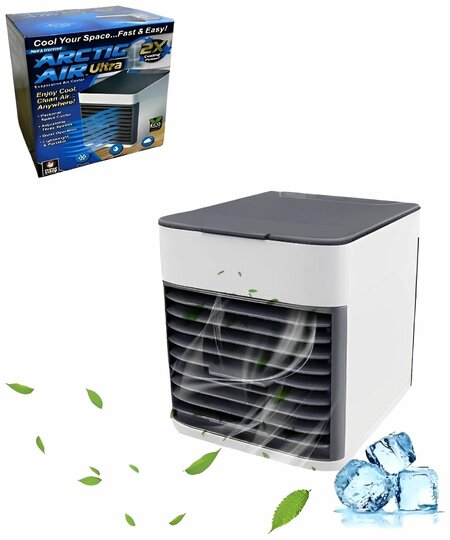 Охладитель воздуха Arctic Air Ultra 2x Основной принцип действия данного устройства заключается в гидроохлаждении. Теплый воздух охлаждается, проходя через влажный фильтр обдуваемый бесшумным вентилятором. В итоге на выходе идет прохладный воздух, нужной вам температуры. Среднее время работы кондиционера с момента включения составляет 6-9 часов. Как работает мини кондиционер? Мини-кондиционер представляет собой куб с резервуаром для воды внутри и двумя решётками по бокам. Вода впитывается испаряющими пластинами из «нанобумаги», а внутренний вентилятор прогоняет через них воздух, увлажняя и очищая его от пыли. Обратите внимание, что устройство не сможет обеспечить прохладой большое помещение. Покрытие кондиционером составляет 2-3 метра вокруг, в пределах которых температура снижается и воздух охлаждается. Мини-кондиционер работает за счёт испарения воды. Испарение происходит почти при любой температуре и зависит от ряда факторов, одним из которых является наличие ветра. Он обеспечивается небольшим вентилятором. Тепло в результате испарения поглощается, а с помощью принудительной конвекции создаётся локальная температурная аномалия. В физике такие процессы, сопровождающие переход воды из жидкого состояния в газообразное, называются адиабатическими. Нечто подобное происходит при применении знакомого многим самодельного кондиционера — мокрого полотенца, повешенного на форточку в летнюю жару. Подобный принцип работы подразумевает и некоторые ограничения: уровень охлаждения воздуха будет зависеть от температуры и влажности в помещении. Соответственно чем прохладнее вода, заливаемая в резервуар устройства, тем сильнее охлаждение. С водой комнатной температуры воздух тоже будет прохладнее. Arctic Air - не только охлаждает и увлажняет воздух – он так же работает как ночник! Этот необыкновенный прибор работает без предварительных настроек и долгих установок. Достаточно заполнить его водой и подключить к электричеству. После заполнения резервуара водой охладитель сможет обеспечивать вас прохладой в течение 6-8 часов. Обратите внимание, что Arctic Air нельзя наклонять, когда в нем есть вода, иначе она разольется. Так же устройство не имеет оповещения о том, что вода в резервуаре закончилась. Как только вода кончается, кондиционер перестает охлаждать помещение и работает как обычный вентилятор. Особенности: Увлажнитель и очиститель воздуха: устройство повышает влажность в помещении и дополнительно очищает воздух, оказывая благоприятное воздействие на здоровье всей семьи. Подключается к любой розетке (с помощью адаптера, в комплект не входит) или порту Usb (Usb кабель входит в комплект) Не содержит фреоны. Компактные размеры. Arctic Air - это компактный персональный охладитель воздуха. Он обладает легким весом и бесшумным вентилятором, который имеет 3 скоростных режима. Устройство быстро создает приятный прохладный микроклимат рядом с вами. С его помощью вы сможете наслаждаться прохладой где угодно: на кухне, в кабинете, в гостиной. Устройство практически бесшумно (около 25-40 дБ) и его можно взять с собой на работу. Характеристики Тип: охладитель-увлажнитель-воздухоочиститель Емкость бака для воды: 0.61 л Инверторная технология: нет Электропитание Потребляемая мощность при охлаждении: 72 Вт Степень защиты: II Функции Увлажнение: да Количество 