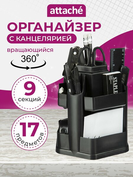 Настольный органайзер для хранения канцелярии отлично подходит для организации рабочего стола в офисе, школе и дома. Он представляет собой функциональный аксессуар, который поможет вам держать все необходимые вещи в порядке и под рукой. Такой комплект с наполнением идеален для учителей, школьников, студентов и первоклассников, стремящихся к порядку. Пластиковая подставка занимает минимум места и вмещает в себя все нужные канцелярские товары для работы. Её размер 137x137x145 мм. Вращающийся на 360 градусов механизм добавляет комфорта при использовании. Комплектация набора: подставка, два карандаша с ластиком, две шариковые ручки, канцелярский нож, точилка, ластик, ножницы (длина - 13 см), блок для записи, линейка, клейкая канцелярская лента (длина - 7 метров, ширина - 12 мм), силовые кнопки, степлер № 10, скобы для степлера № 10, антистеплер, скрепки. Подставка оснащена 9 отделениями разного размера, что позволяет каждому предмету иметь свое место. Подходит для широкого спектра задач — от повседневной работы до школьных или творческих проектов. Она станет незаменимым помощником как для ребенка, так и взрослого. Офисные принадлежности теперь всегда под рукой благодаря этому практичному изделию!
