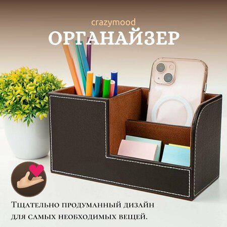 Настольный органайзер для канцтоваров: стильный и функциональный Настольный органайзер для канцтоваров из искусственной кожи от CRAZY MOOD – это стильный и функциональный аксессуар для поддержания порядка на вашем рабочем столе. Прочная конструкция и искусственная кожа Органайзер-держатель для канцелярских товаров изготовлен из прочной конструкции, а поверхность покрыта искусственной кожей. Это обеспечивает долговечность и стильный внешний вид аксессуара. Органайзер имеет антискользящую поверхность Антискользящая поверхность предотвращает случайное перемещение органайзера на вашем столе. Подарочный вариант и размеры Этот органайзер также может стать отличным подарком для ваших коллег или друзей. Размеры органайзера составляют 20 x 9 х11 см, что делает его компактным и удобным для использования. Выбирая настольный органайзер для канцтоваров от CRAZY MOOD, вы получаете стильный, функциональный и практичный аксессуар для поддержания порядка на вашем рабочем столе. Цвет товара может незначительно отличаться от цвета на фото.